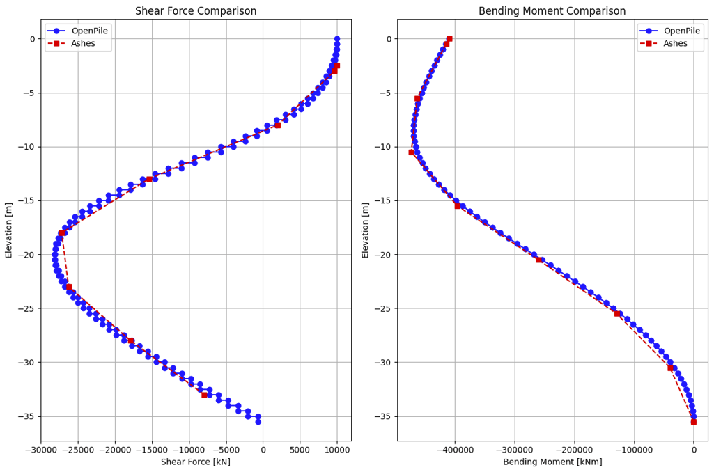 The data from OpenPile was provided to us by an Ashes user. The figure below shows the shear force and bending moment at different locations along the pile.