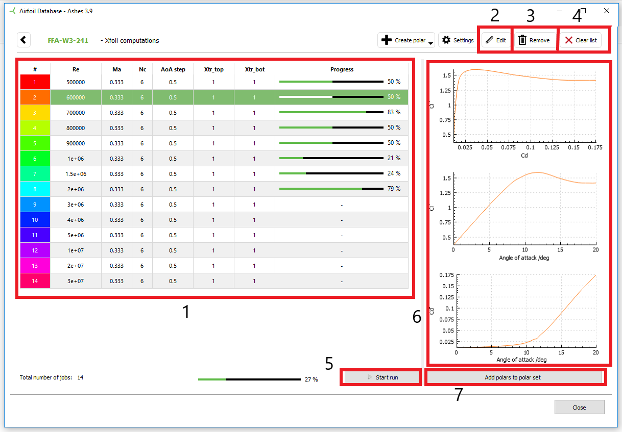 - Xfoil computations list: all the computations that have been defined for this polar are listed here. The parameters for each computation are shown, and a progress bar appears once the computation is started