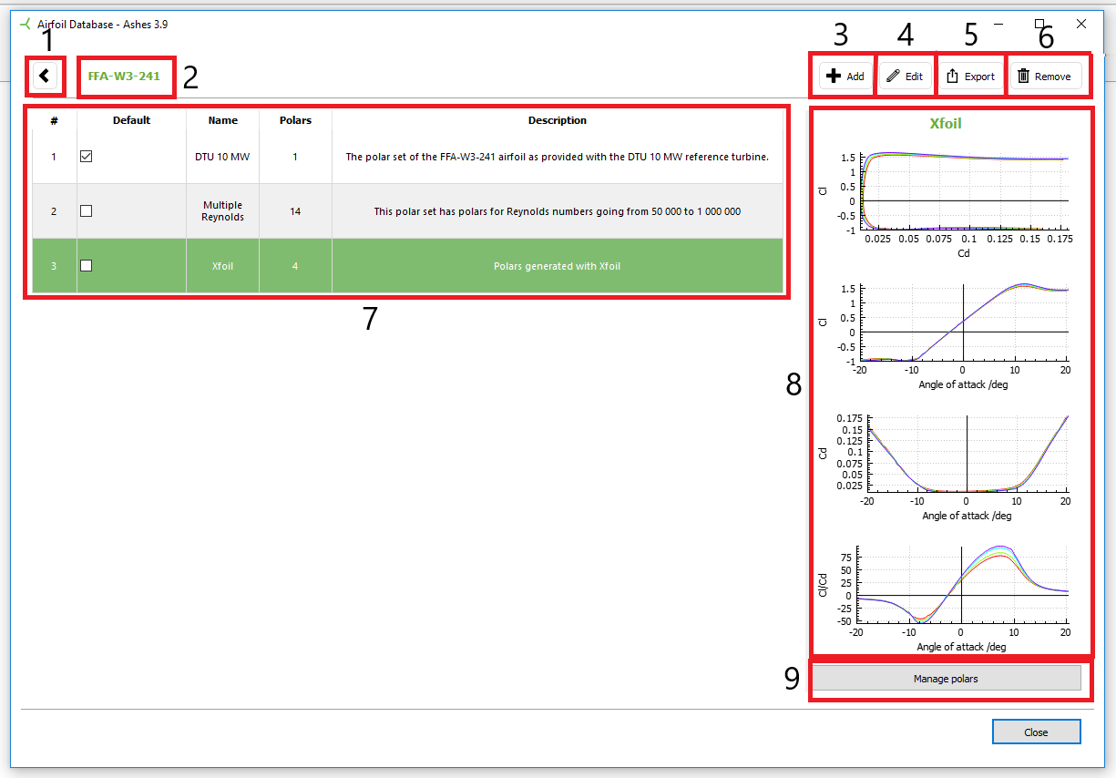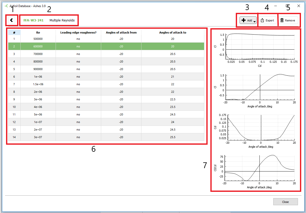 - Export: export selected polar to a text file (see Airfoil polar file for more info)