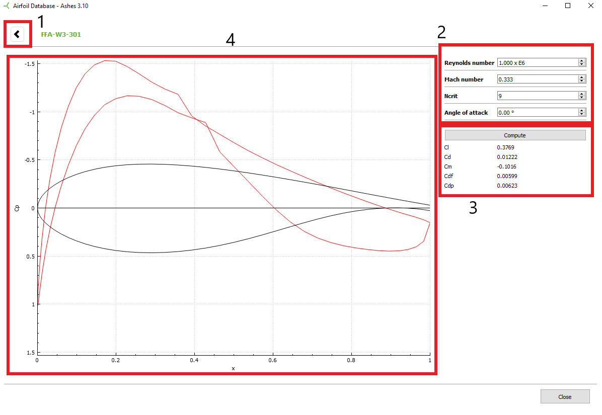 - Compute: clicking this button will start the Xfoil computation. Below the button you can find some of the results of the computation