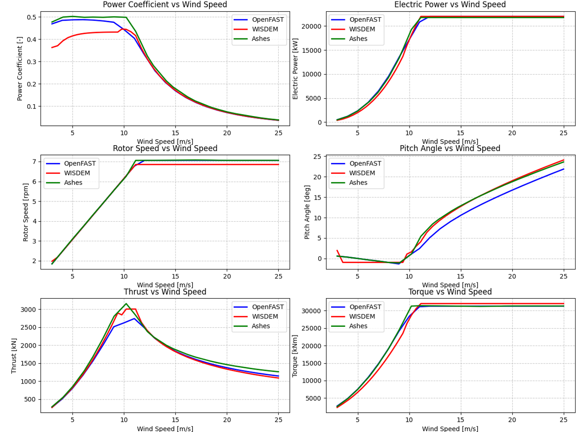 The comparison between Ashes, WISDEM and OpenFAST is shown in the figure below: